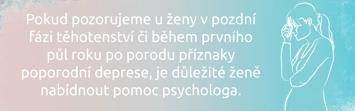 Pokud pozorujete u ženy v pozdní fázi těhotenství či během prvního půl roku po porodu několika těchto příznaků a trvají déle než dva týdny, je důležité ženě nabídnout pomoc psychologa či psychiatra. V případě vážného podezření na sebevražedné tendence či poškození dítěte má zdravotnický personál oznamovací povinnost. Doporučuje se konzultace s pediatrem, který pravidelně vídá novorozence a může zhodnotit stav, popřípadě informovat OSPOD. Poporodní deprese je léčitelná a s řádnou podporou a léčbou může žena získat zpět svou pohodu a kvalitu života. Poskytovatelé péče mohou hrát zásadní roli v zachycení a započetí léčby poporodní deprese a jiných duševních obtíží. Jsou první, kdo může poskytnout emocionální podporu, poslouchají ženy a pomáhají jim hledat způsoby, jak zvládnout stres a úzkost spojené s mateřstvím.