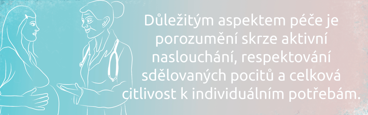 Důležitým aspektem je empatie a porozumění, kam patří aktivní naslouchání, respektování sdělovaných pocitů a celková citlivost k individuálním potřebám žen nejenom ze strany zdravotnického personálu, ale i partnera a rodiny. Je důležité, aby žena měla možnost otevřeně komunikovat ohledně svých emocí, potřeb a obav. Vždy je třeba respektovat individuální preference péče a podpora každé ženy individuálně. Emoční podpora snižuje úrovně stresu a úzkosti. Je běžné, že se žena cítí nejistá, vyčerpaná nebo přetížená a její pocity by měly být brány vážně. Všichni poskytovatelé péče mohou být důležitou emocionální oporou pro ženu během tohoto citlivého období.